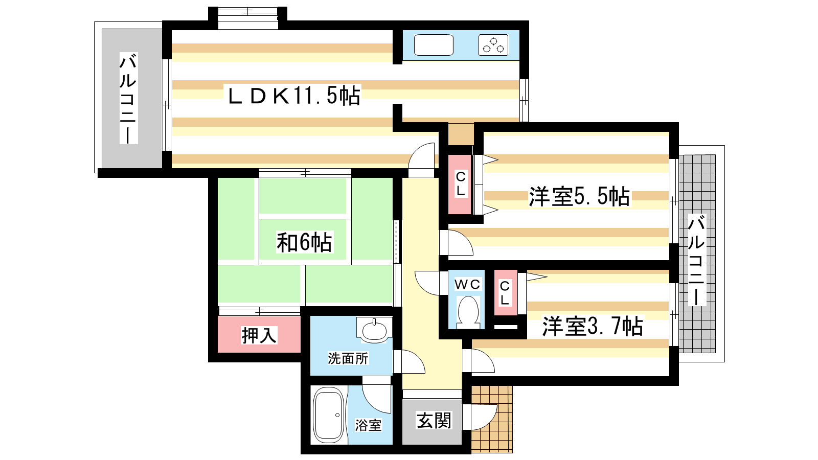 - 洋室3.7帖、洋室5.5帖、和室6帖、LDK11.5帖