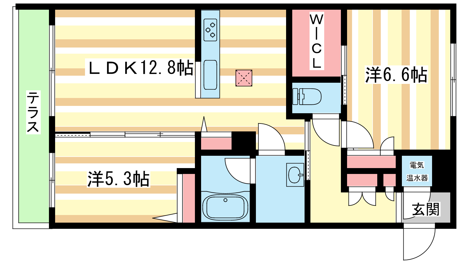 - LDK12.8帖、洋室6.6帖、洋室5.3帖