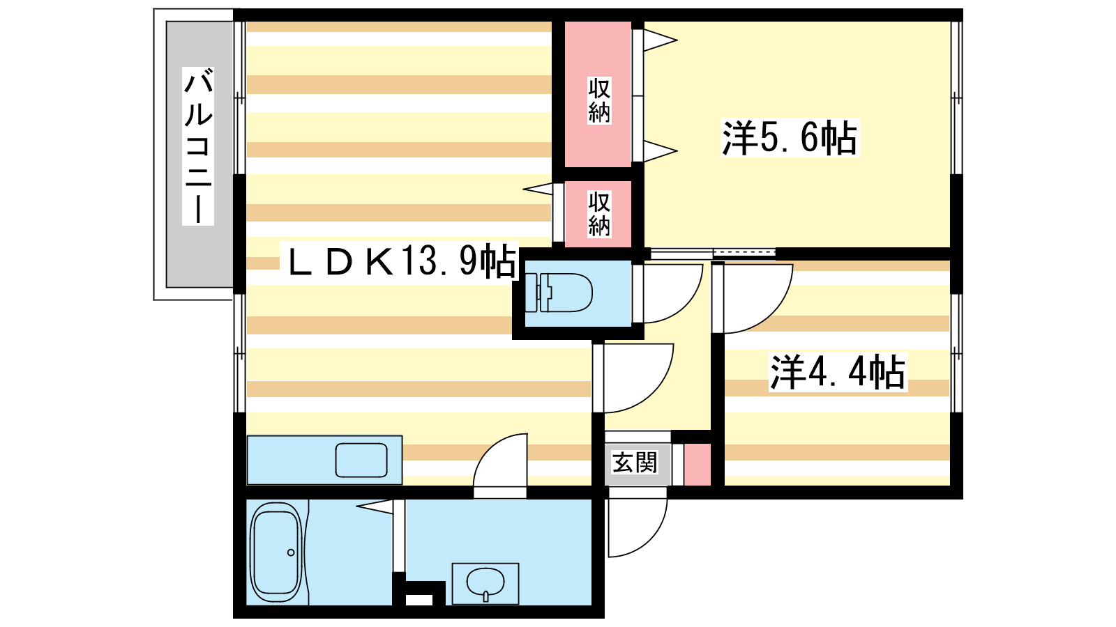 - LDK13.9帖、洋室5.6帖、洋室4.4帖
