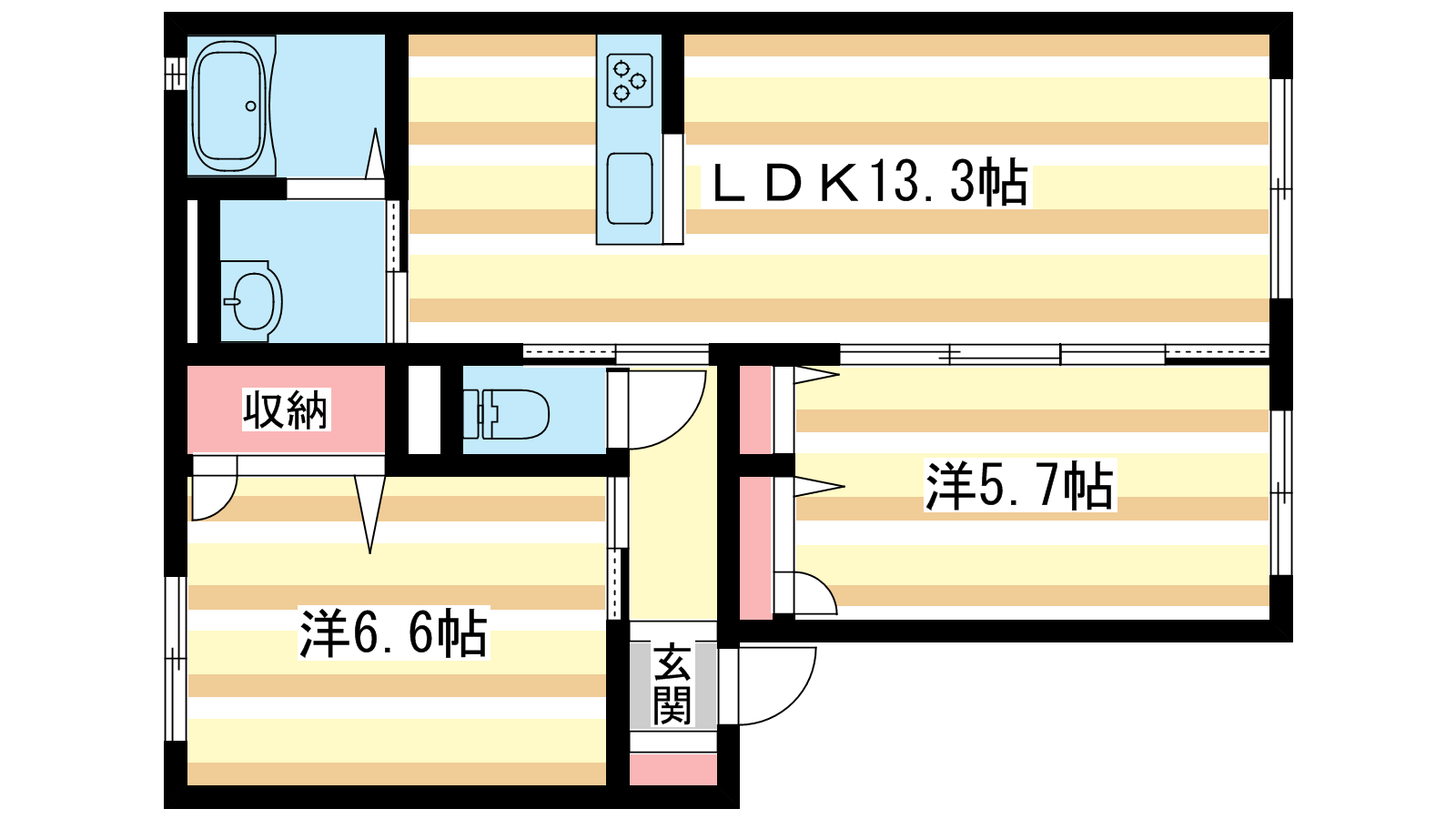- LDK13.3帖、洋室5.7帖、洋室6.6帖