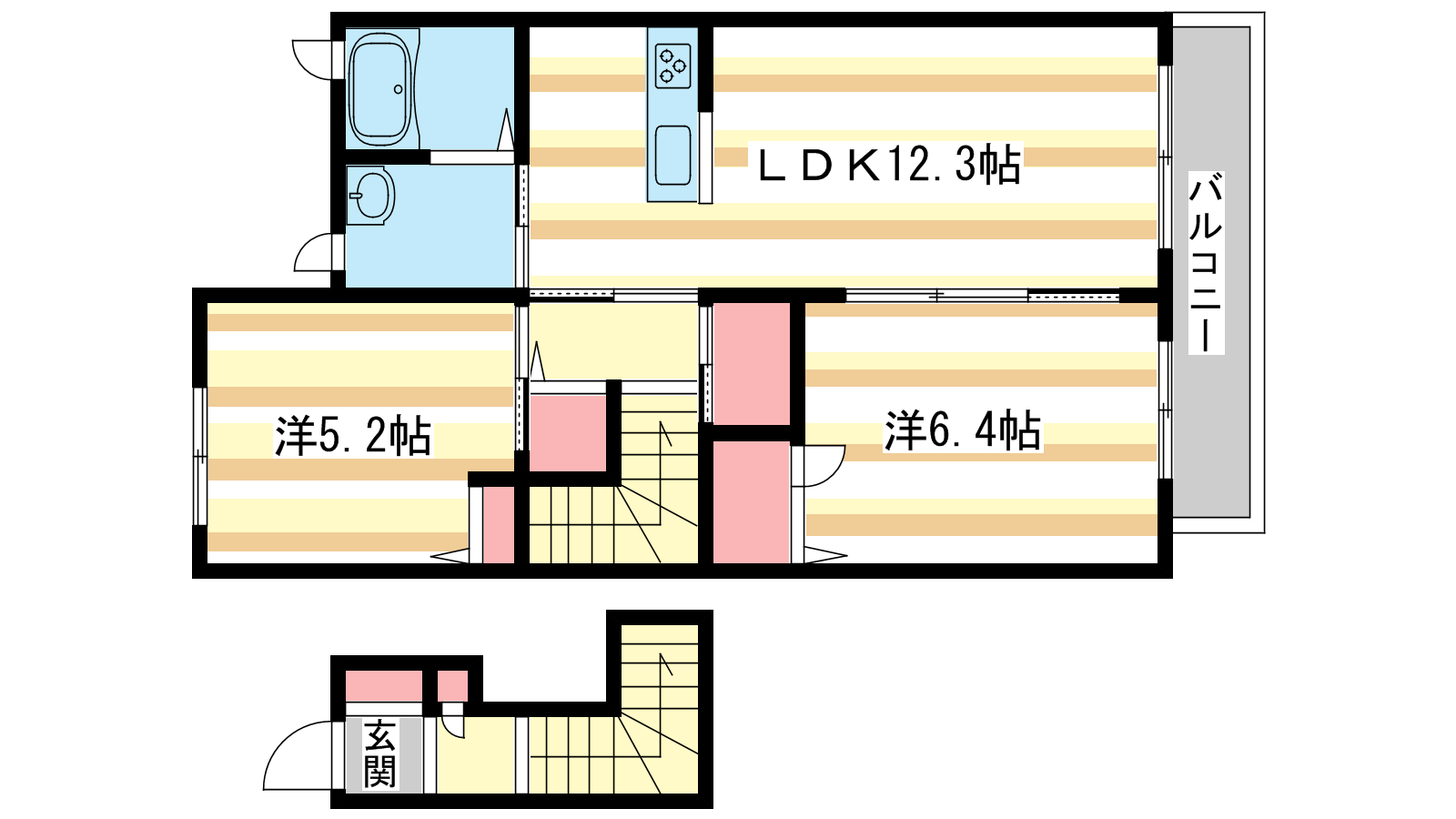 - LDK12.3帖、洋室6.4帖、洋室5.2帖