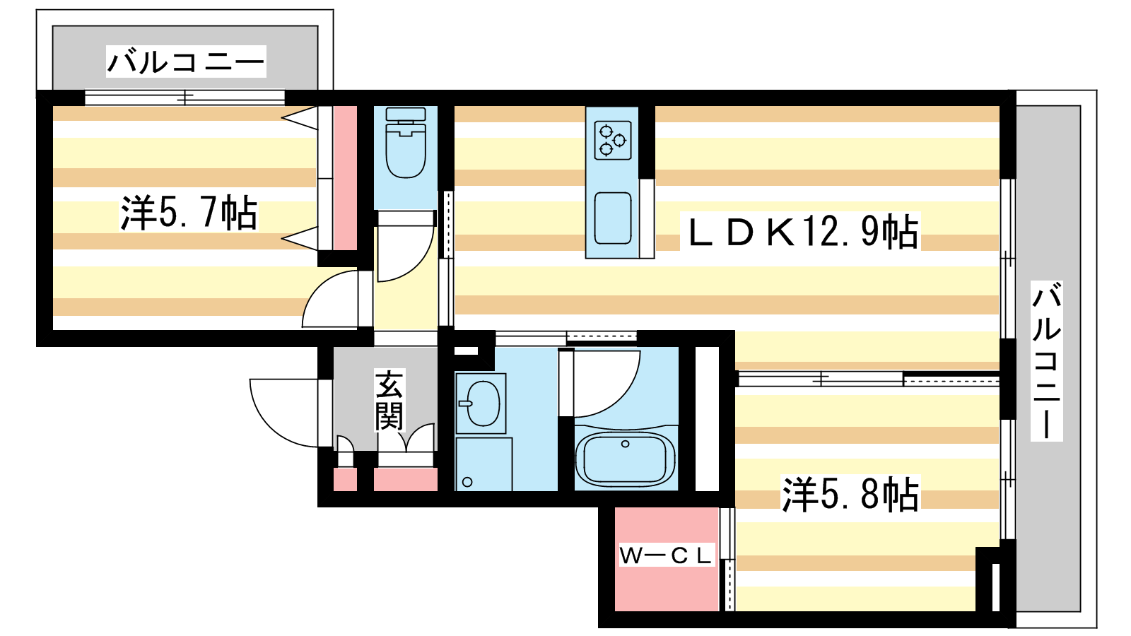 - LDK12.9帖、洋室5.8帖、洋室5.7帖