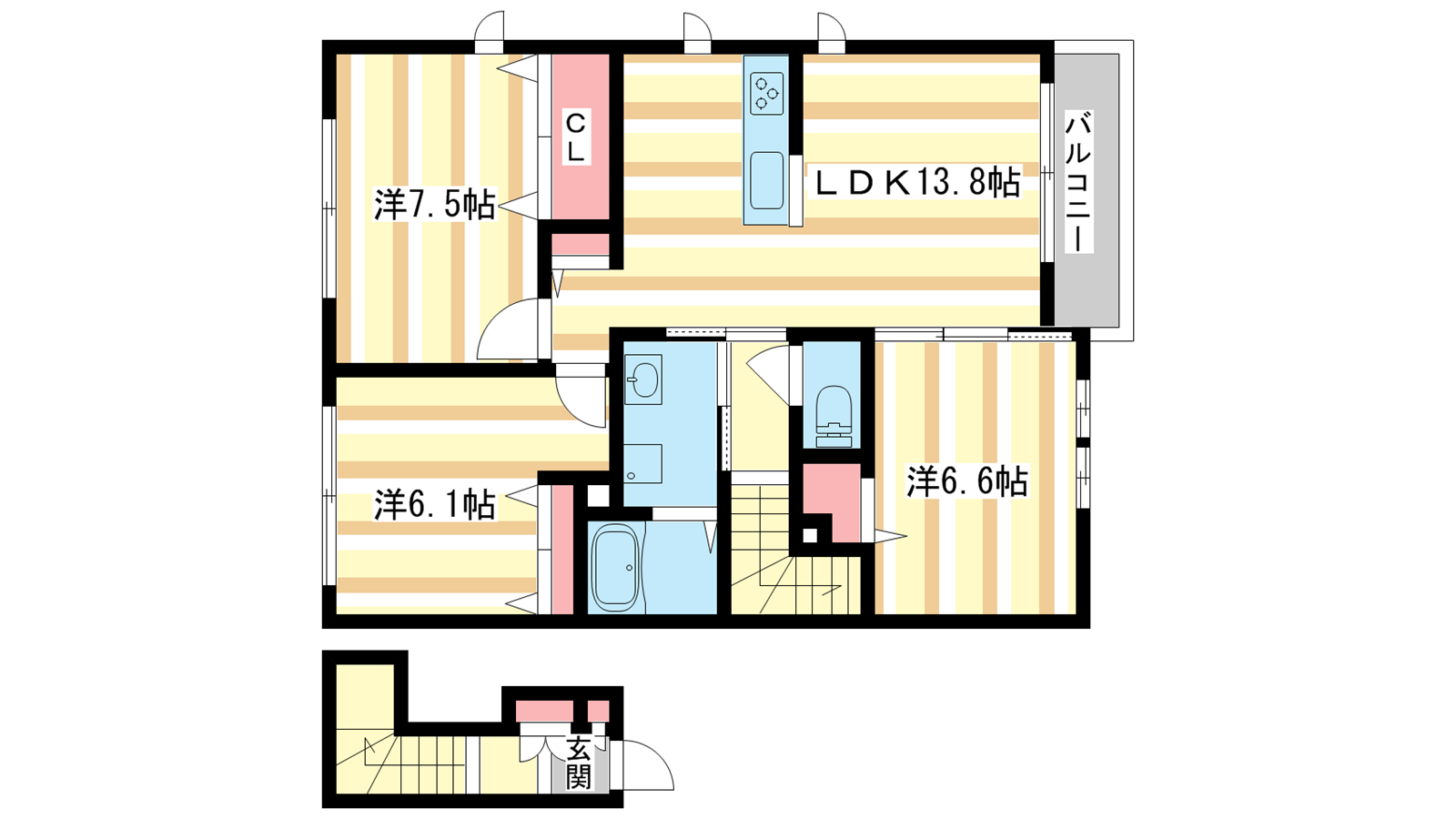 - LDK13.8帖、洋室7.5帖、洋室6.6帖、洋室6.1帖