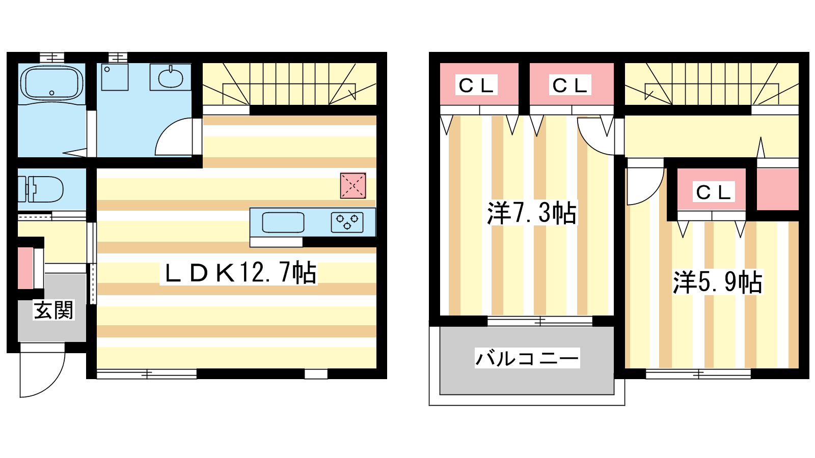 - LDK12.7帖、洋室7.3帖、洋室5.9帖