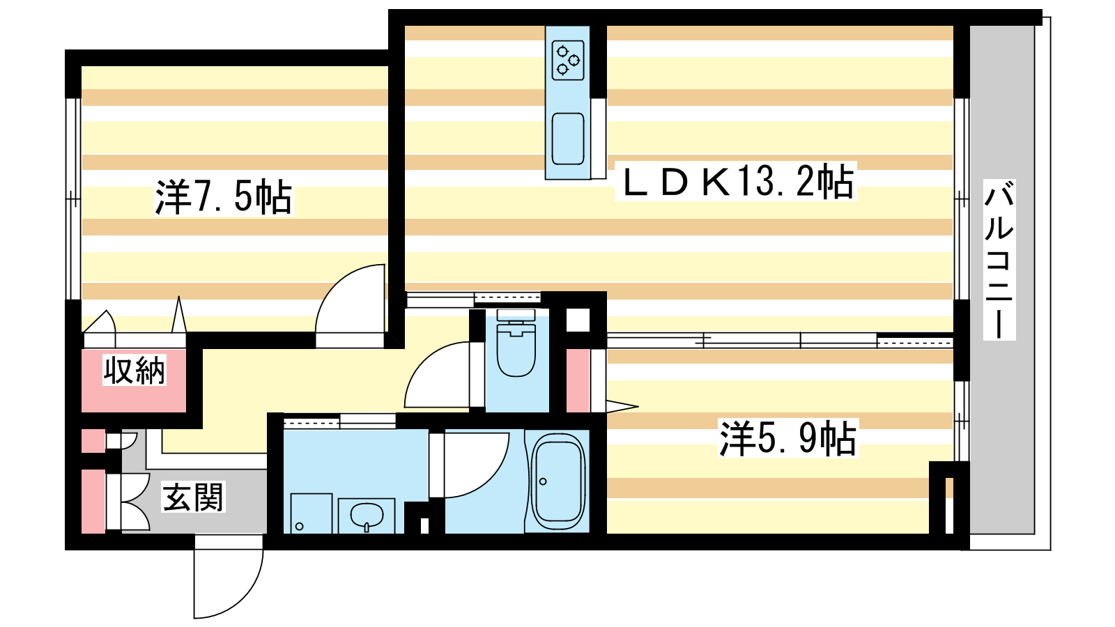 - LDK13.2帖、洋室7.5帖、洋室5.9帖