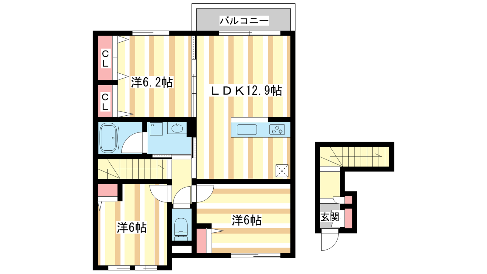 - LDK12.9帖、洋室6.2帖、洋室6帖、洋室6帖