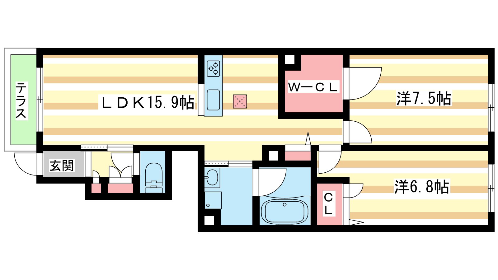 - LDK15.9帖、洋室7.5帖、洋室6.8帖