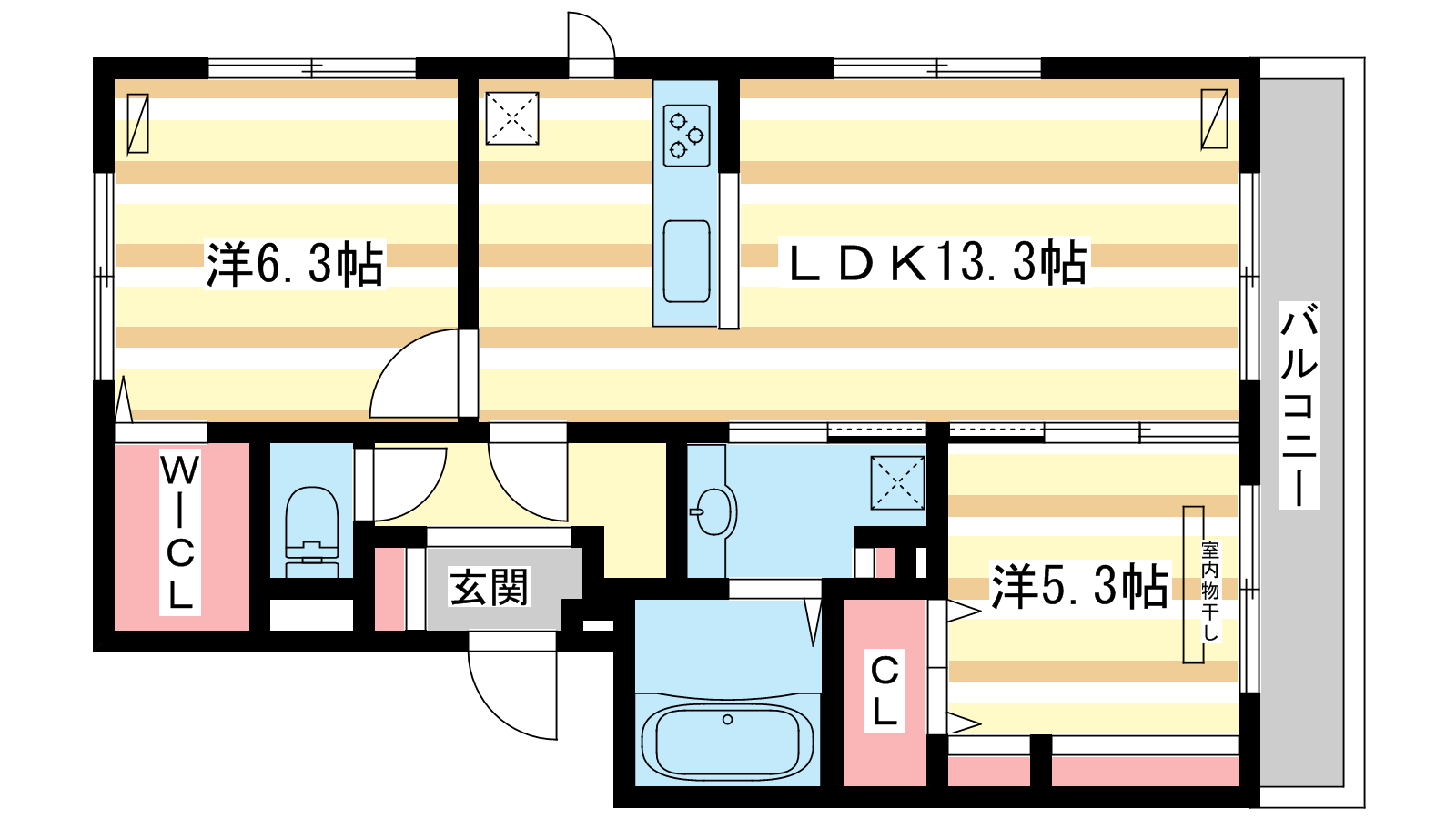 - LDK13.3帖、洋室6.3帖、洋室5.3帖