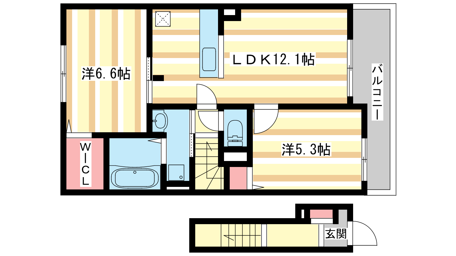 - LDK12.1帖、洋室6.6帖、洋室5.3帖