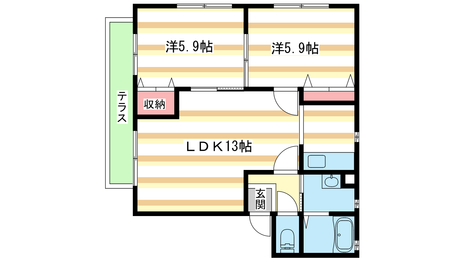 - LDK13帖、洋室5.9帖、和室5.9帖