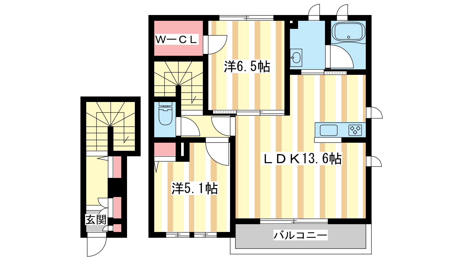 - LDK13.6帖、洋室6.5帖、洋室5.1帖