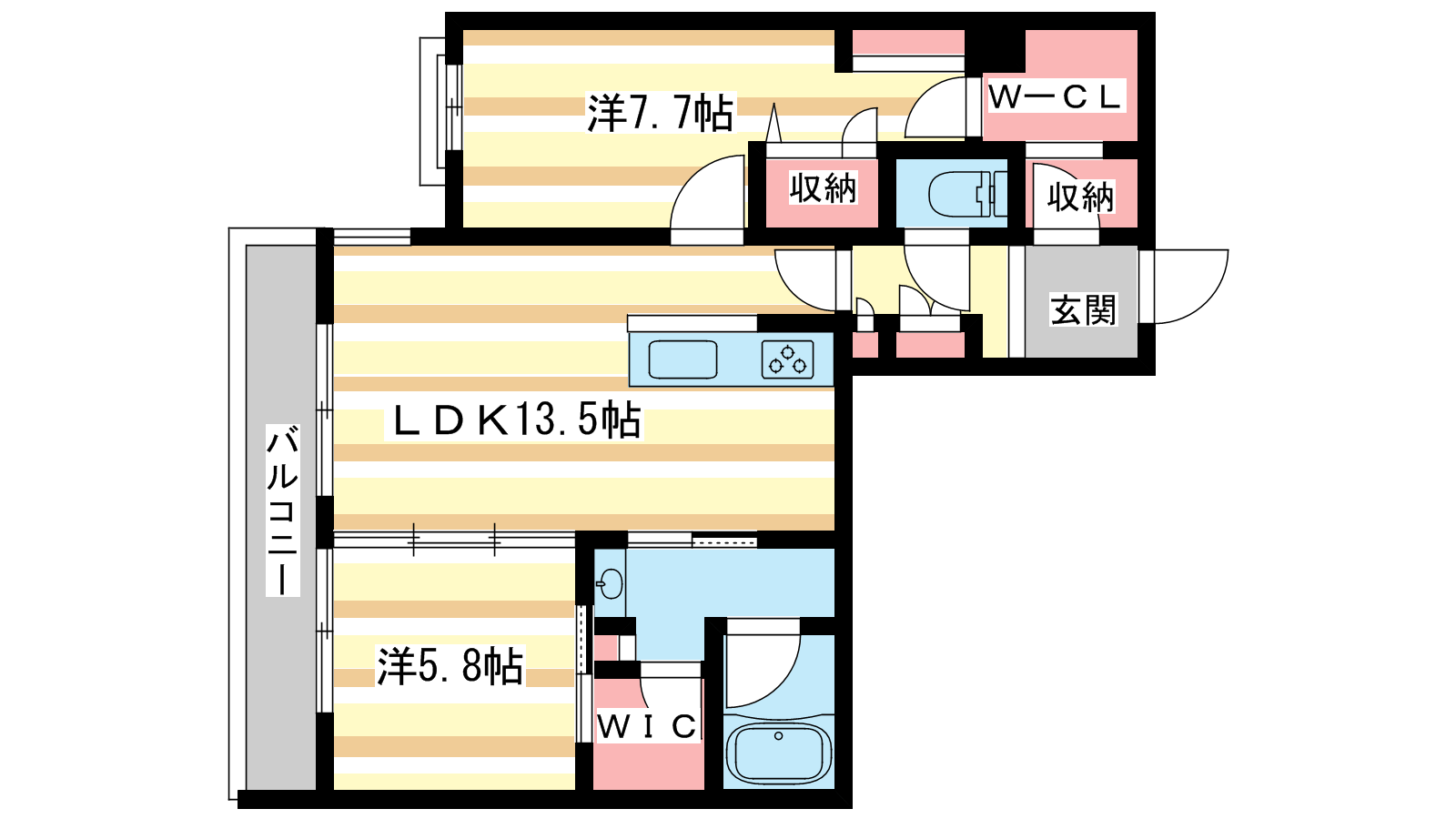 - LDK13.5帖、洋室7.7帖、洋室5.8帖