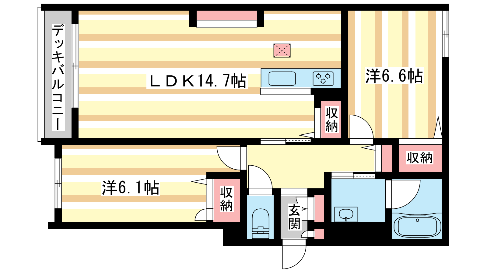 - LDK14.7帖、洋室6.6帖、洋室6.1帖