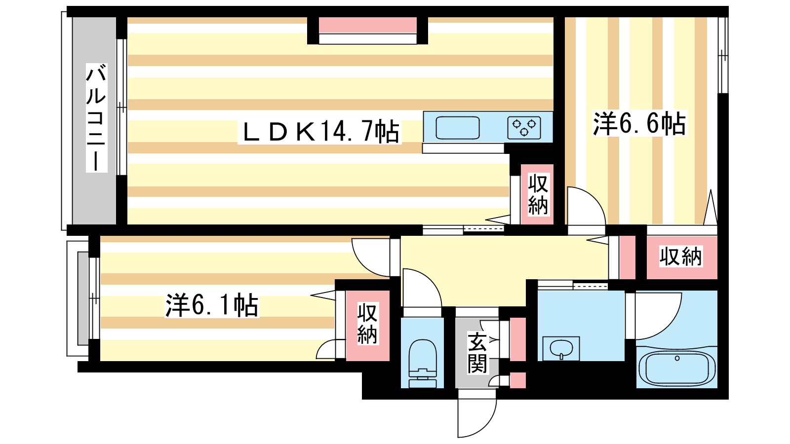 - LDK14.7帖、洋室6.6帖、洋室6.1帖
