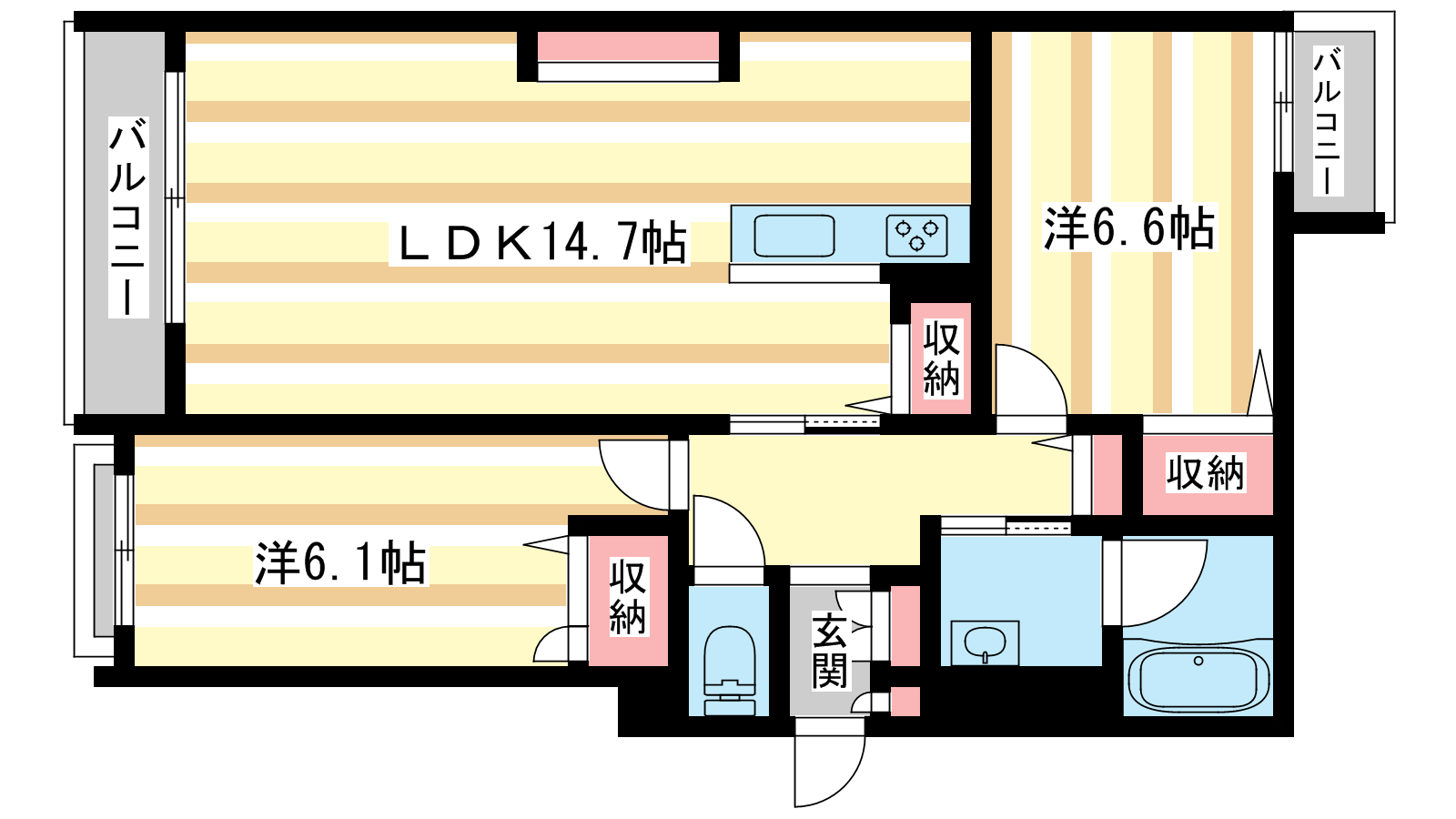 - LDK14.7帖、洋室6.6帖、洋室6.1帖