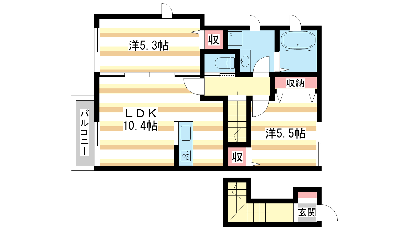 - LDK10.4帖、洋室5.5帖、洋室5.3帖