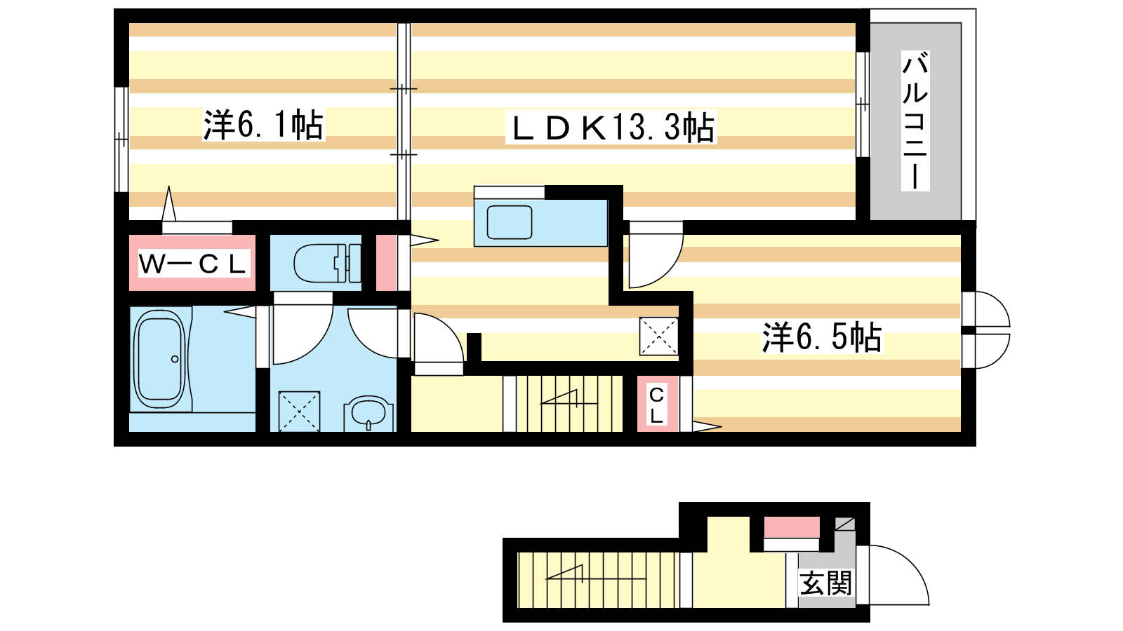 - LDK13.3帖、洋室6.1帖、洋室6.5帖