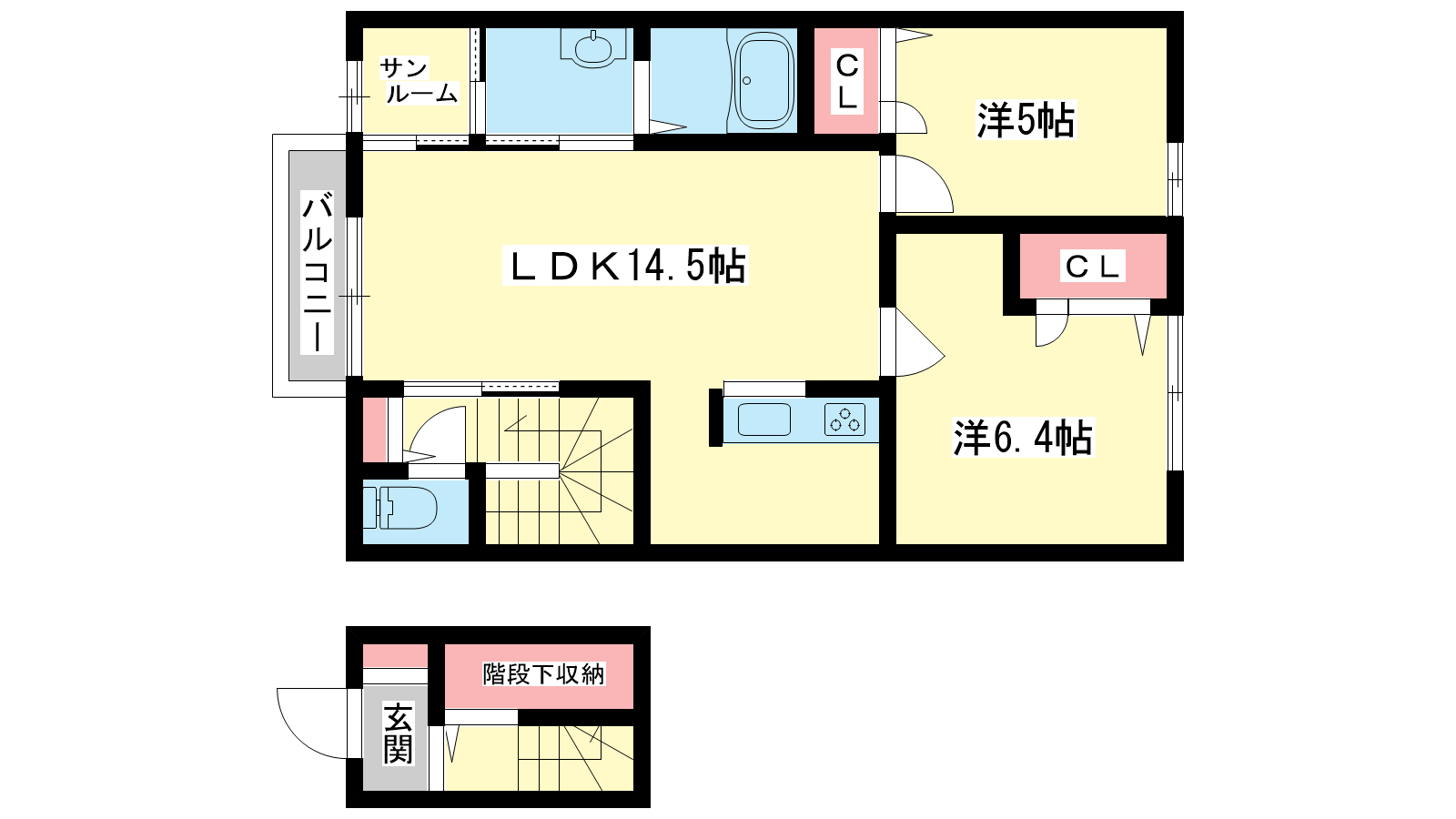 - LDK14.5帖、洋室6.4帖、洋室5帖