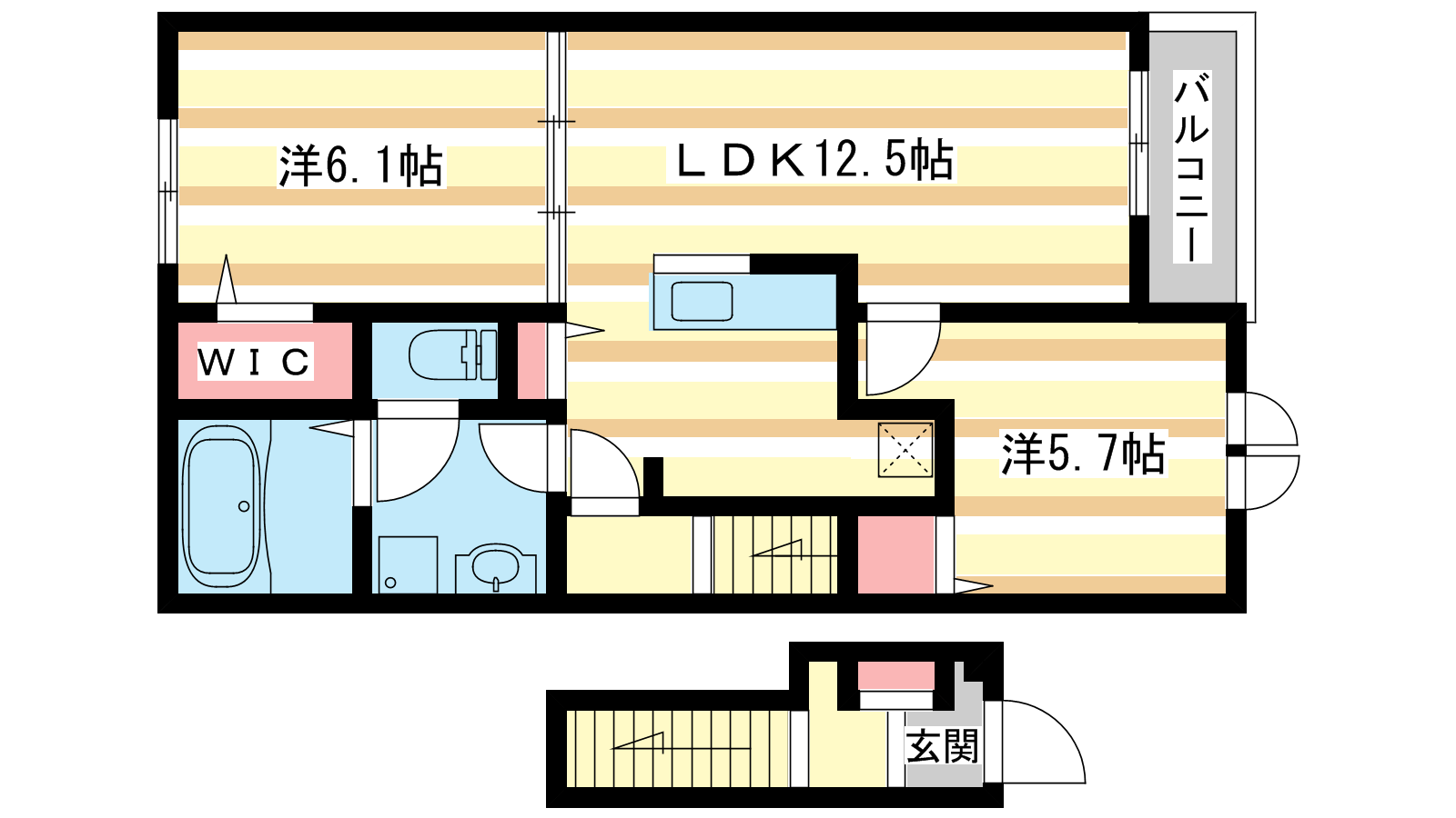 - LDK12.5帖、洋室6.1帖、洋室5.7帖