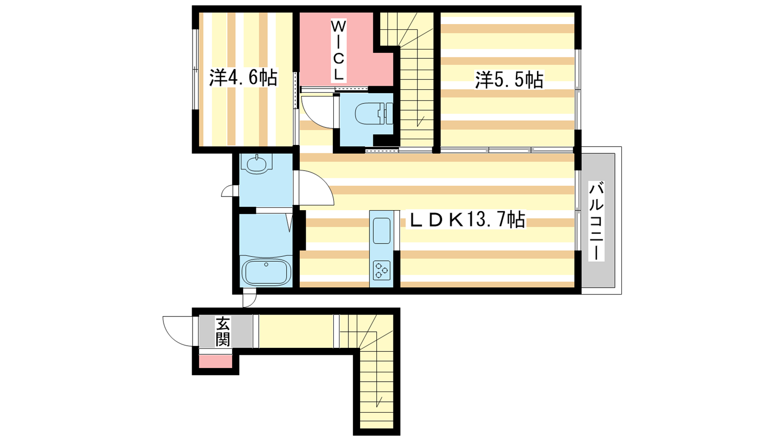 - LDK13.7帖、洋室5.5帖、洋室4.6帖