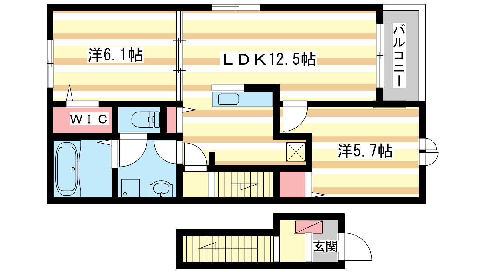- LDK12.5帖、洋室6.1帖、洋室5.7帖