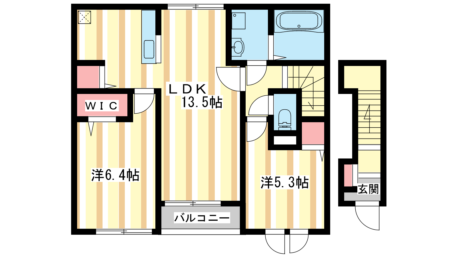 - LDK13.5帖、洋室6.4帖、洋室5.3帖