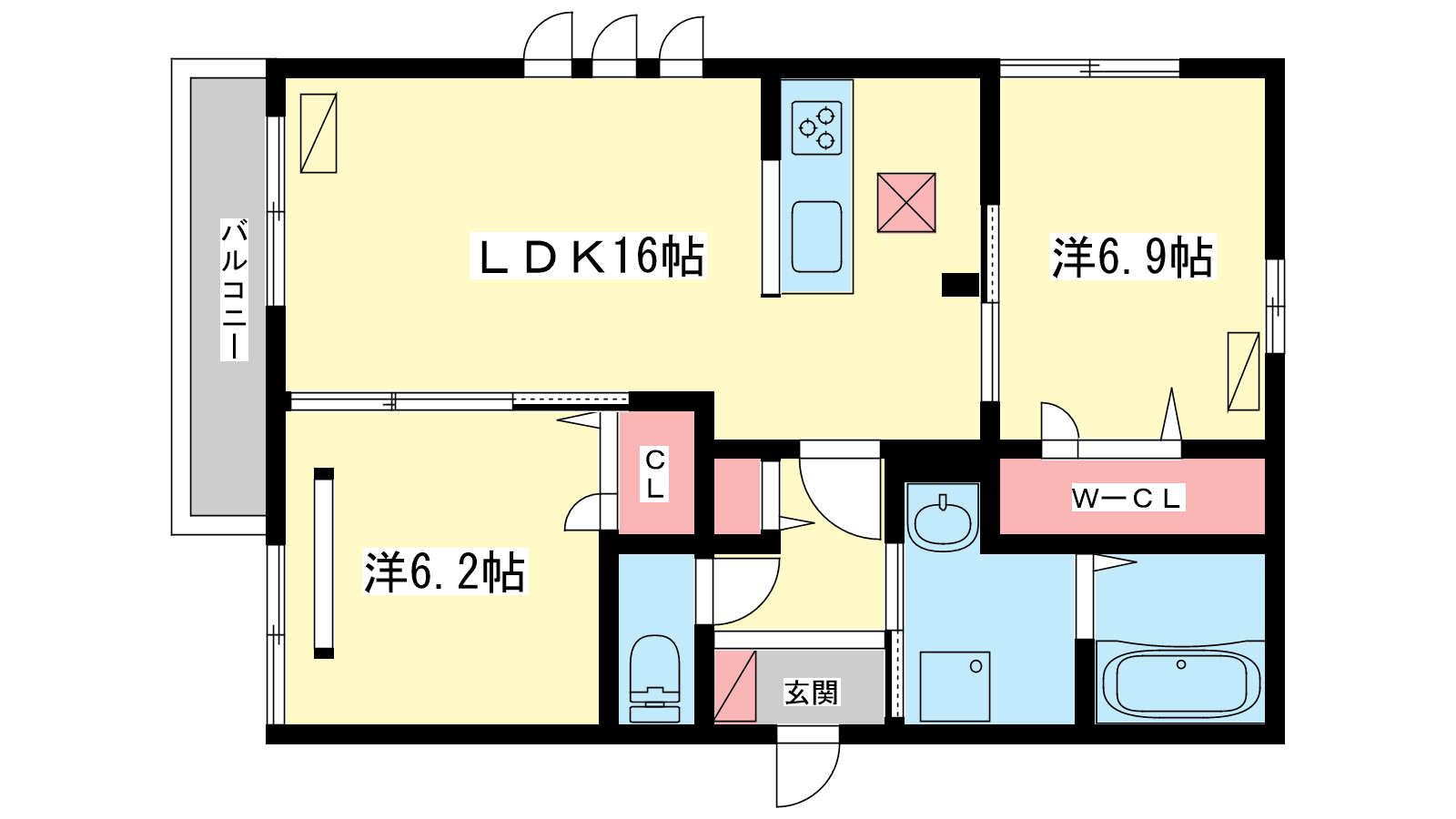 - LDK16帖、洋室6.9帖、洋室6.2帖