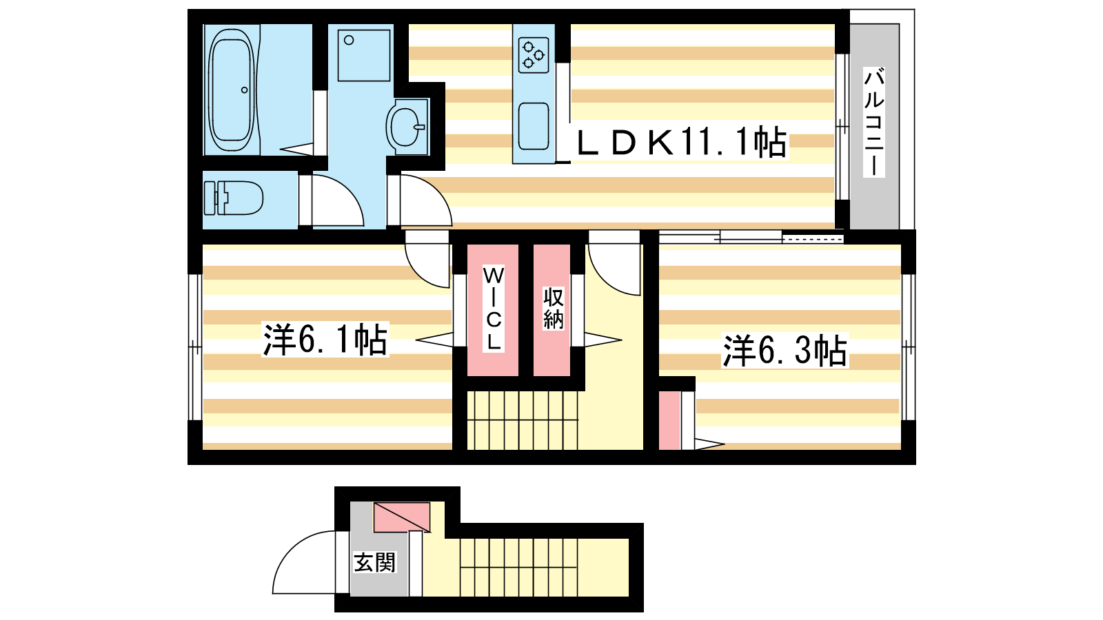 - LDK11.1帖、洋室6.3帖、洋室6.1帖