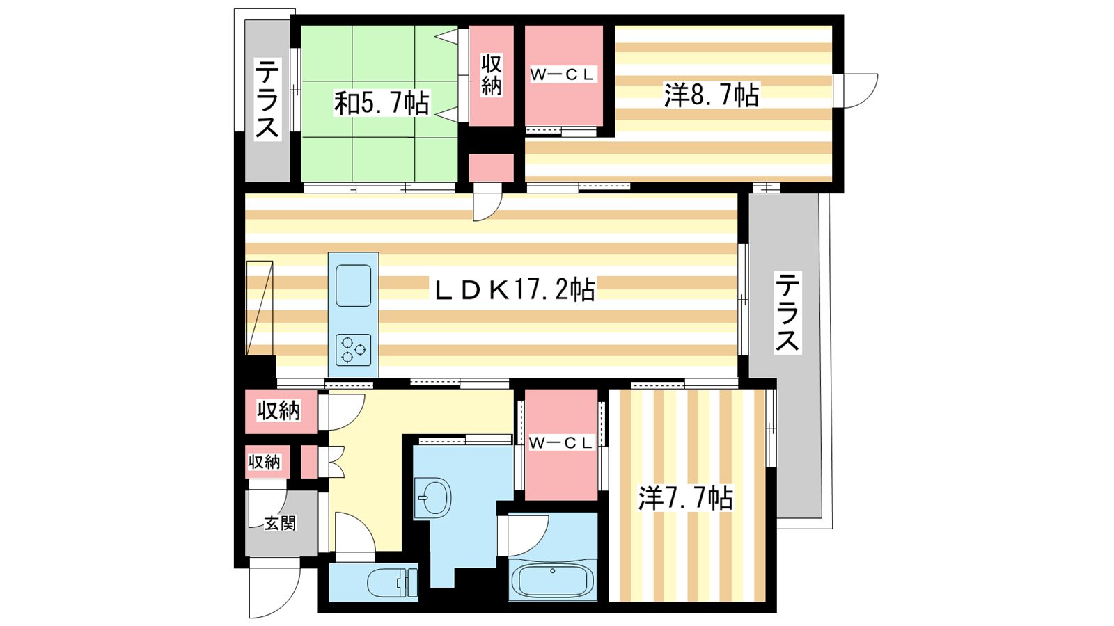- LDK17.2帖、洋室8.7帖、洋室7.7帖、和室5.7帖