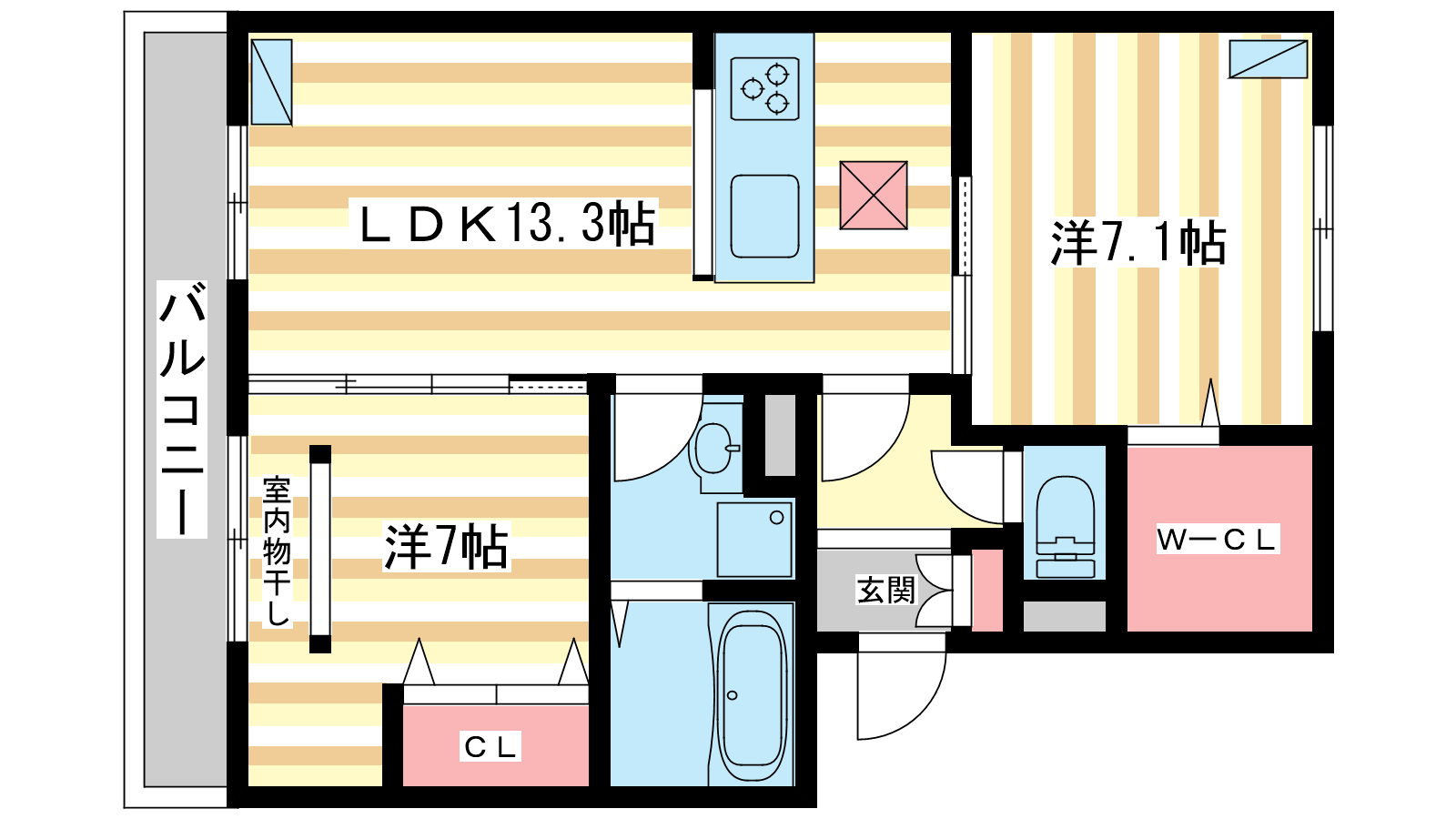 - LDK13.3帖、洋室7.1帖、洋室7帖