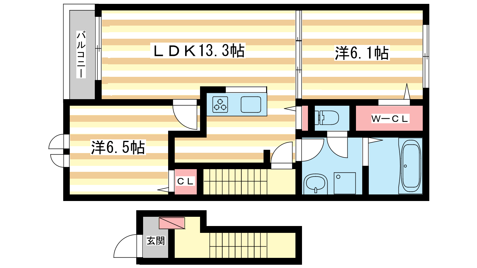- LDK13.3帖、洋室6.5帖、洋室6.1帖