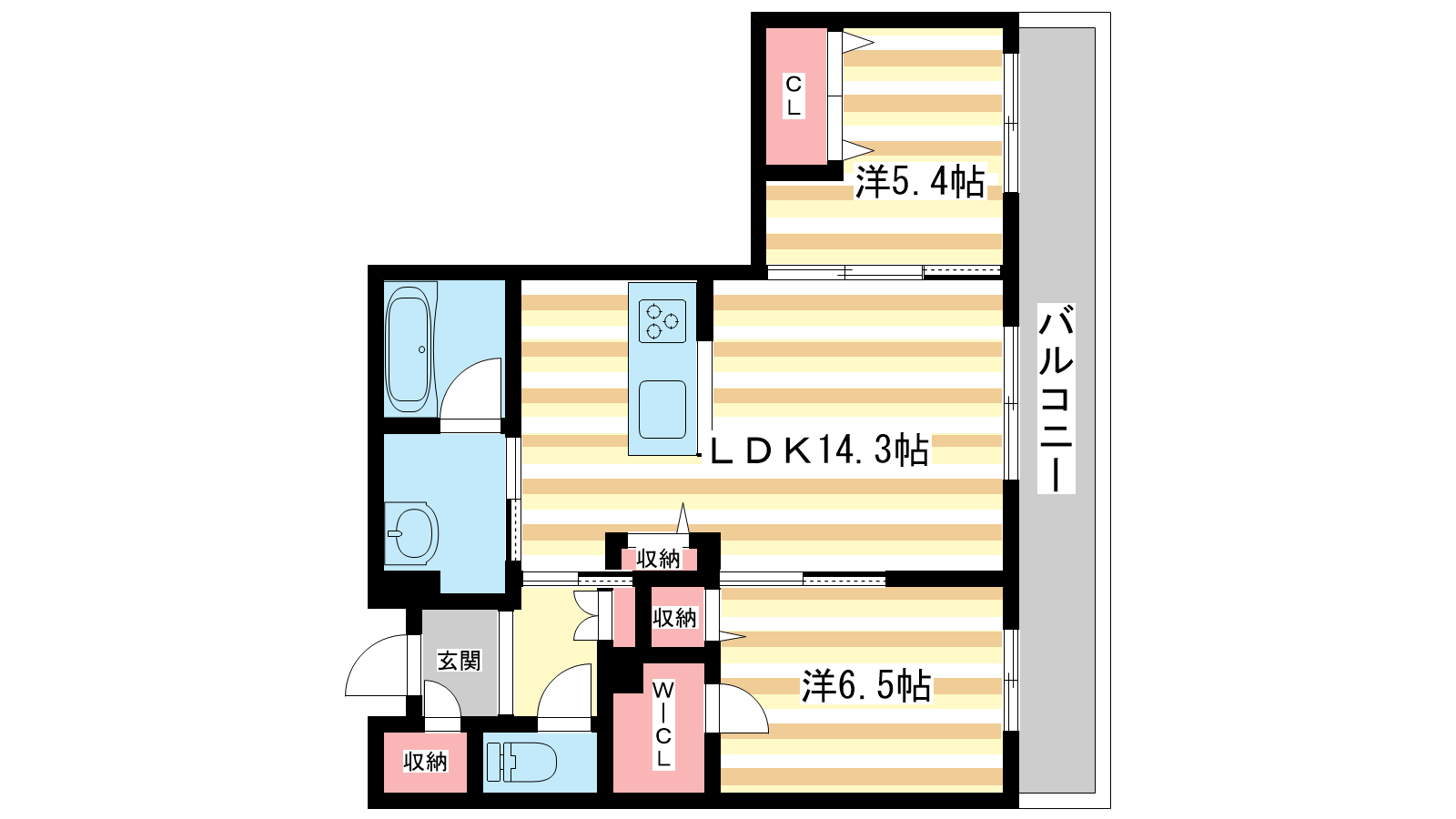 - LDK14.3帖、洋室6.5帖、洋室5.4帖