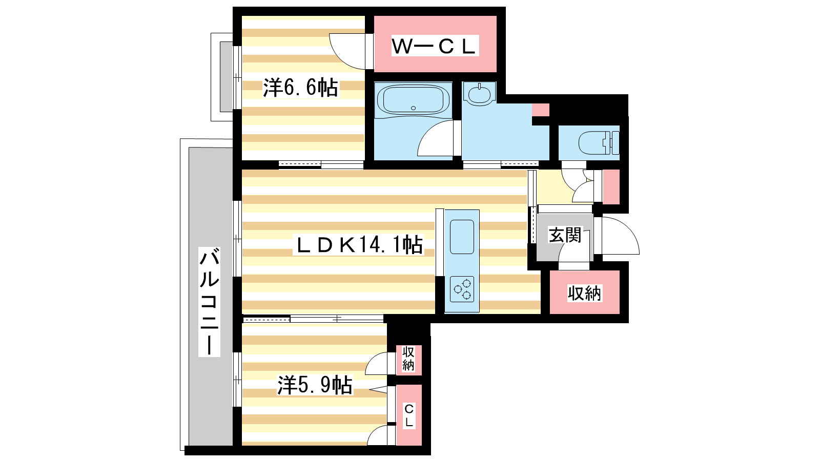 - LDK14.1帖、洋室6.6帖、洋室5.9帖