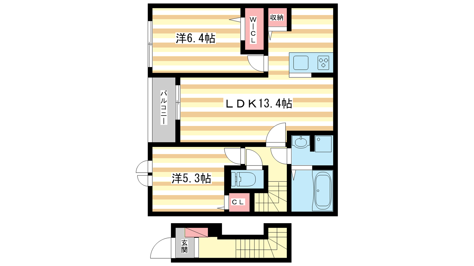 - LDK13.4帖、洋室6.4帖、洋室5.3帖