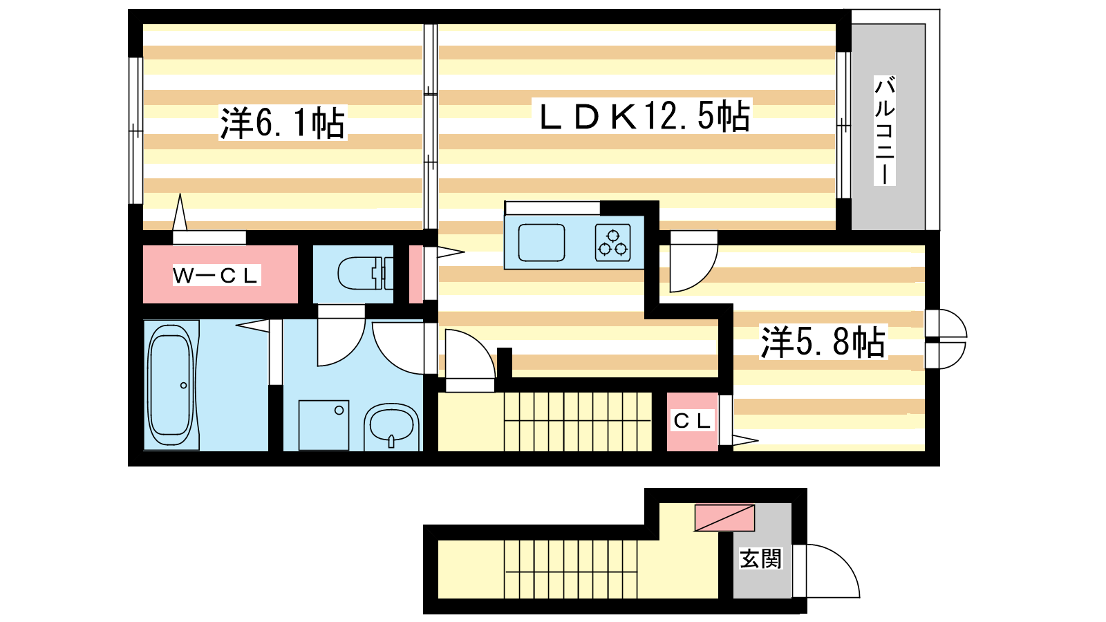 - LDK12.5帖、洋室6.1帖、洋室5.8帖