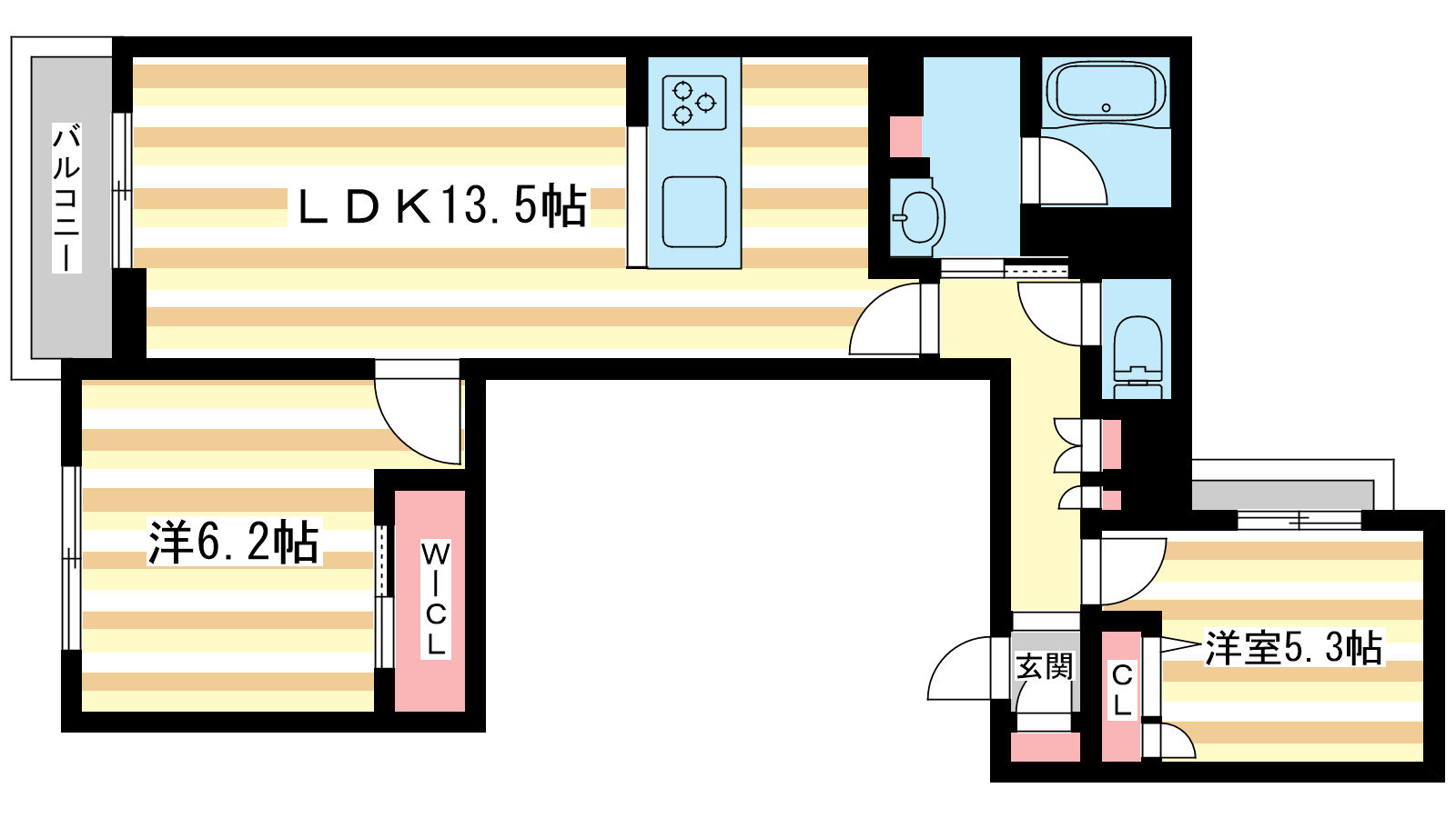 - LDK13.5帖、洋室6.2帖、洋室5.3帖