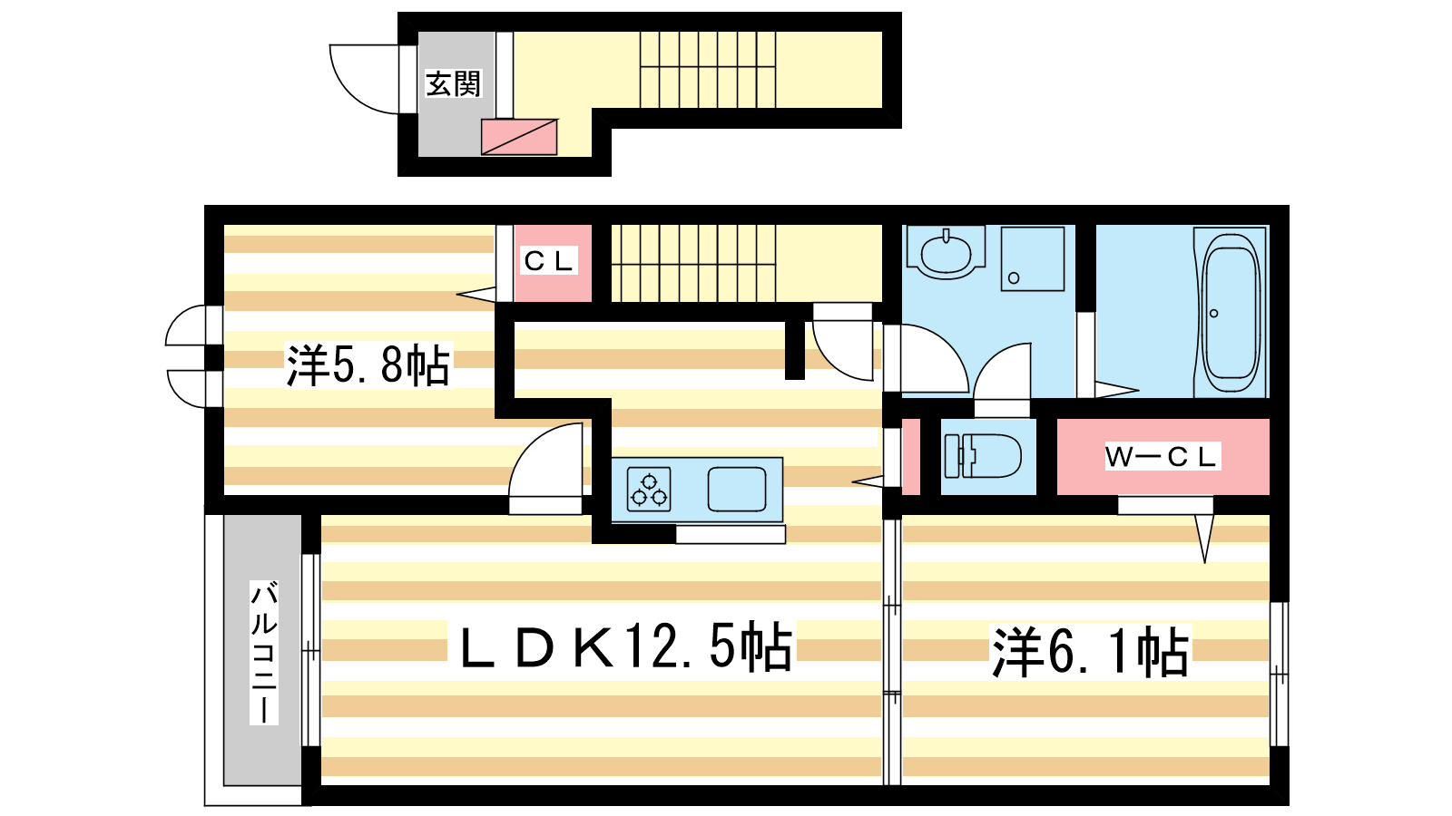 - LDK12.5帖、洋室6.1帖、洋室5.8帖