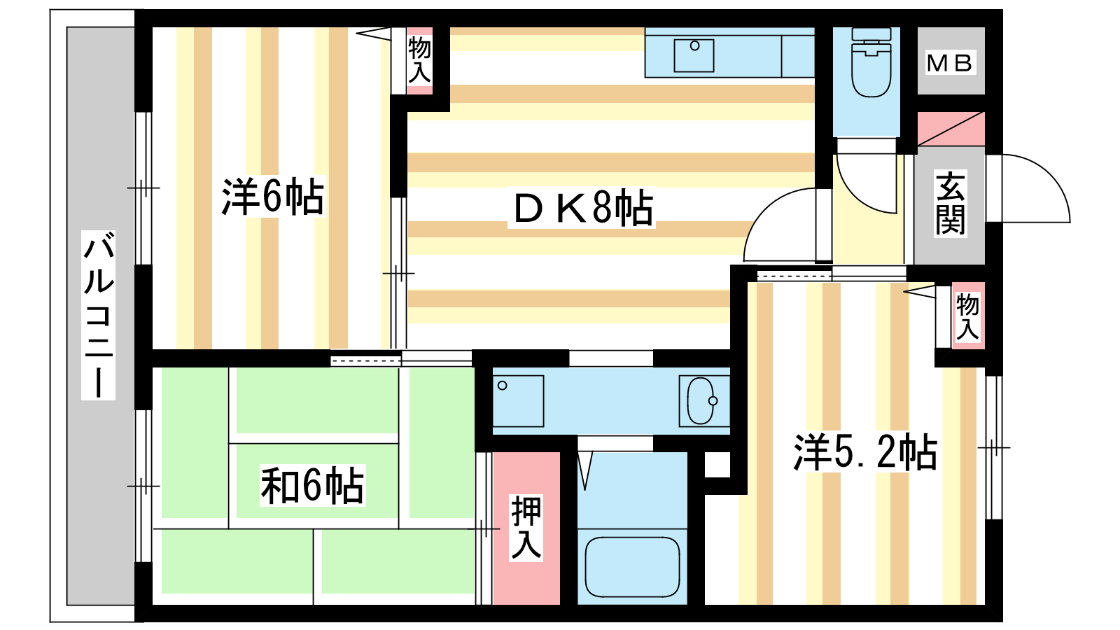 - DK8帖、洋室6帖、和室6帖、洋室5.2帖