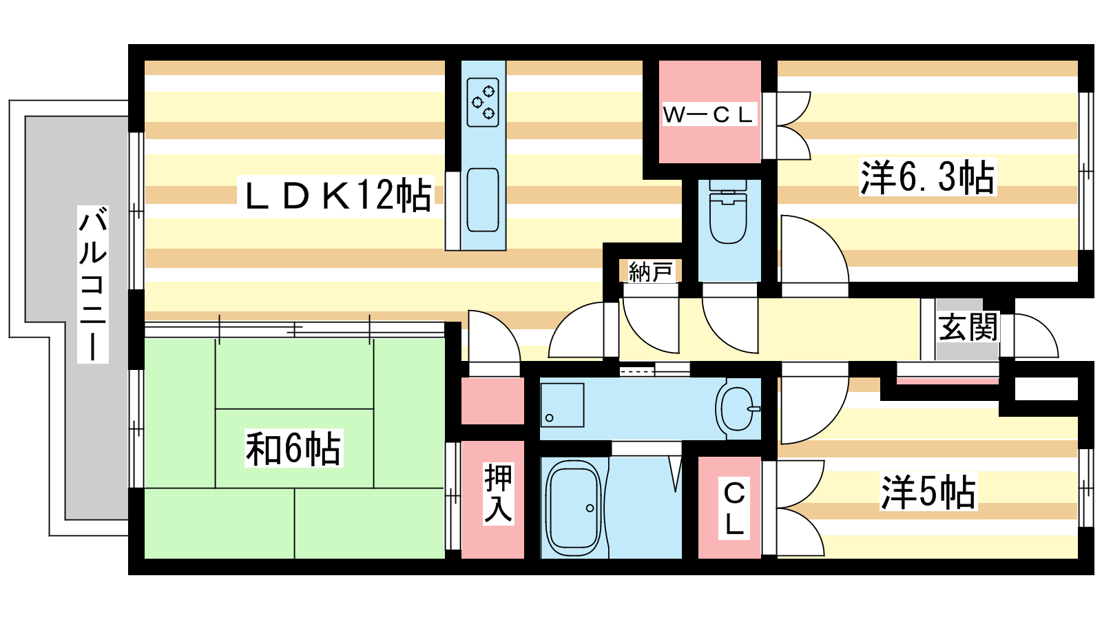 - LDK12帖、洋室6.3帖、洋室5帖、和室6帖