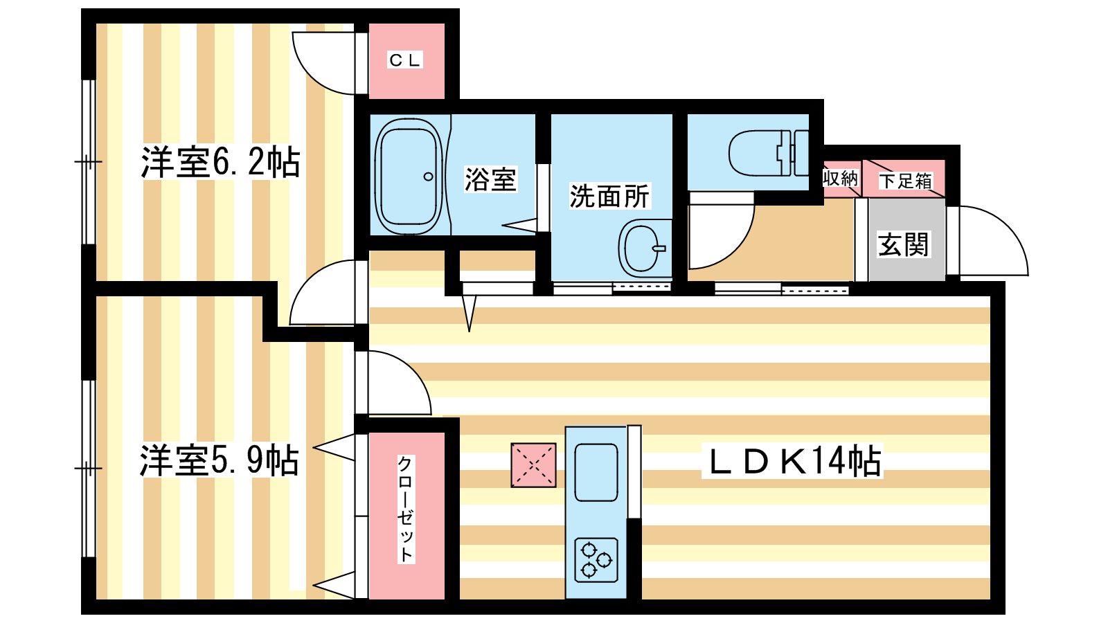- LDK14帖、洋室6.2帖、洋室5.9帖