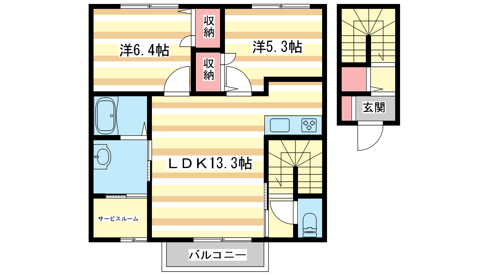 - LDK13.3帖、洋室6.4帖、洋室5.3帖