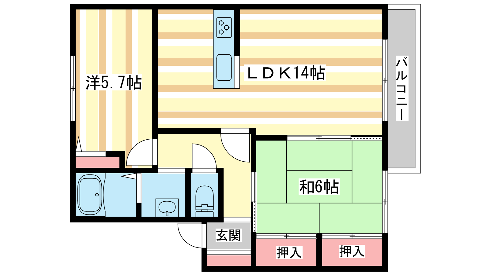 - LDK14帖、洋室5.7帖、和室5.9帖