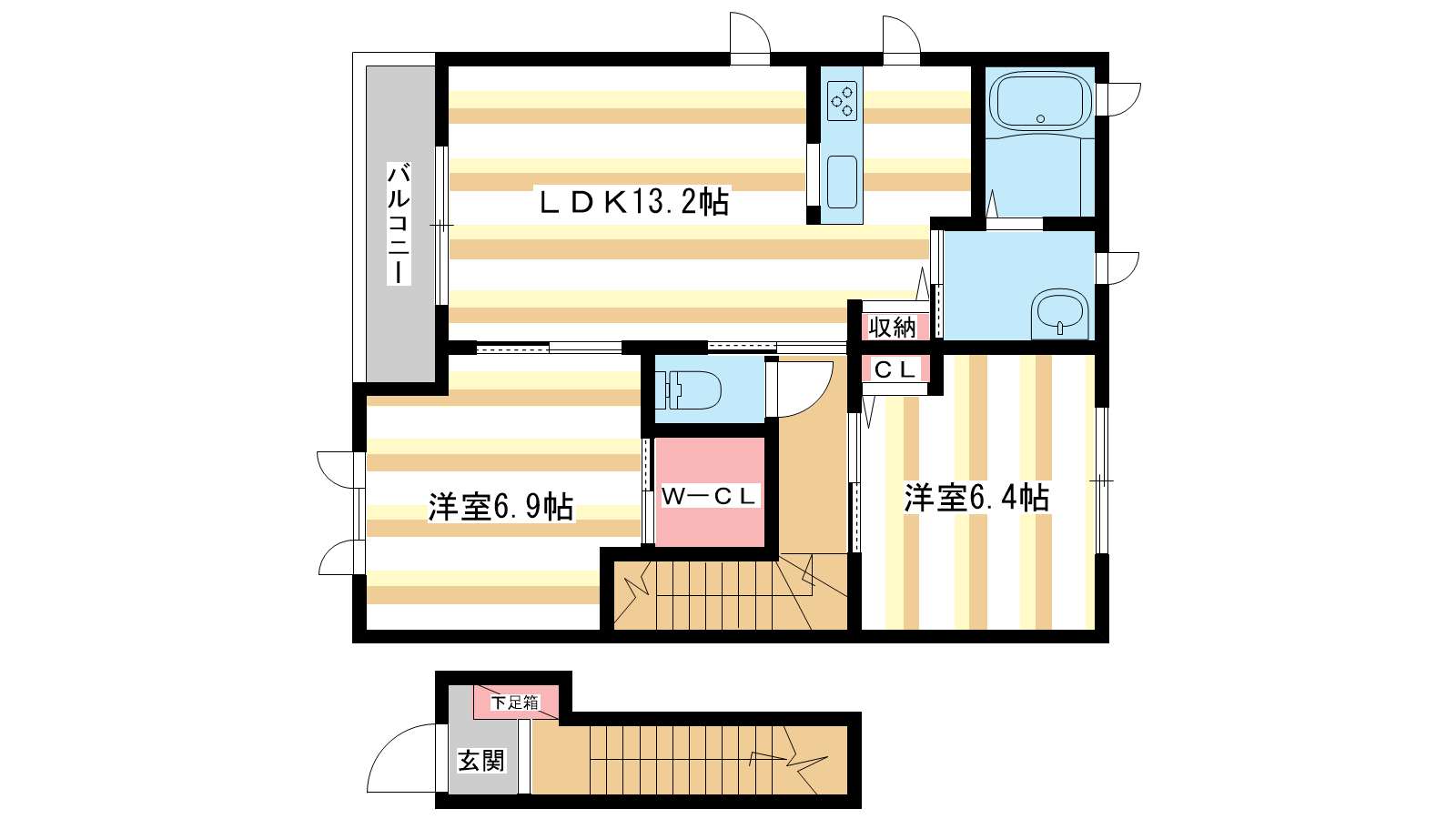 - LDK13.2帖、洋室6.9帖、洋室6.4帖