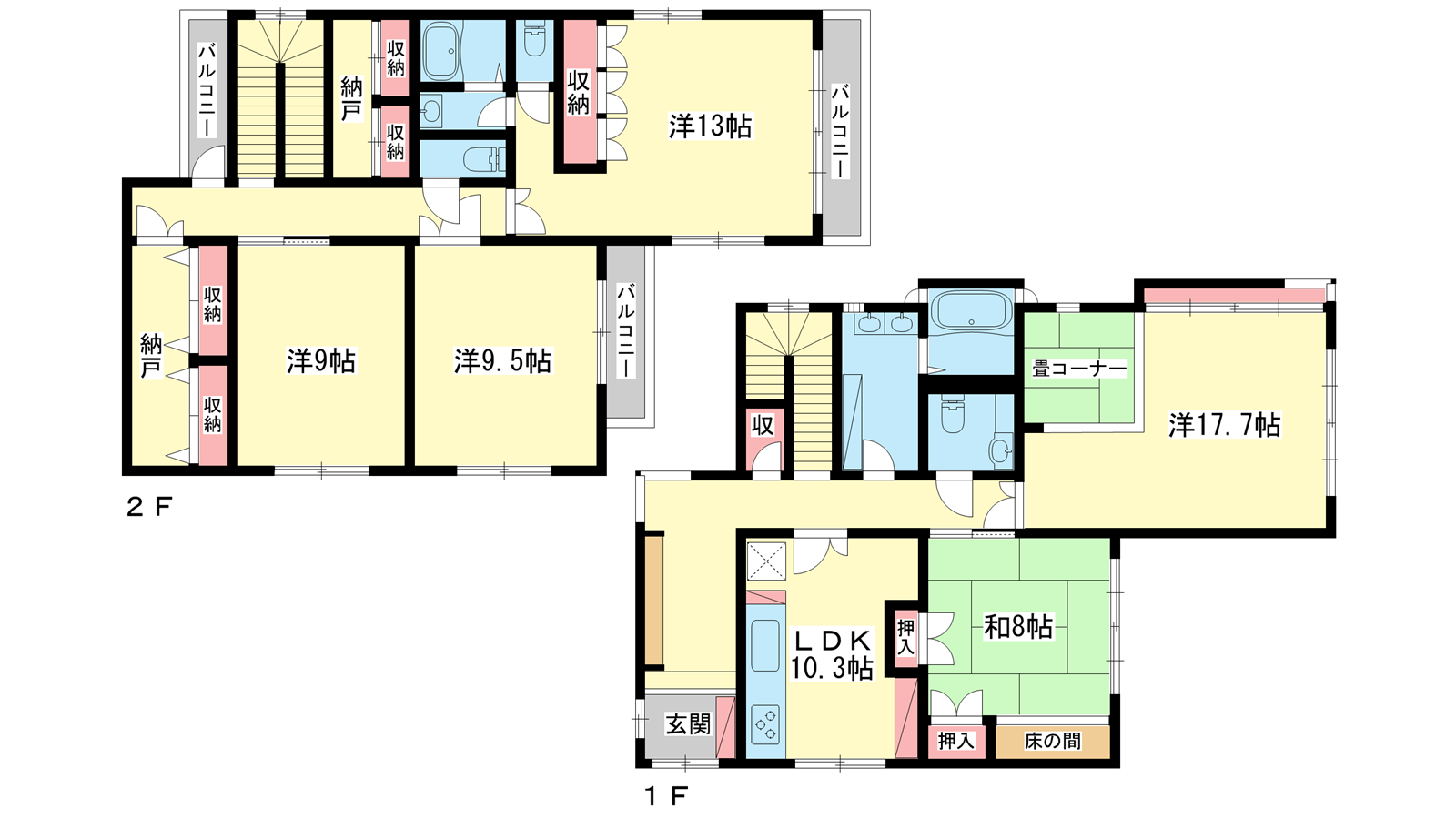- LDK10.8帖、洋室17.7帖、洋室13帖、洋室9.5帖、洋室9帖、和室8帖