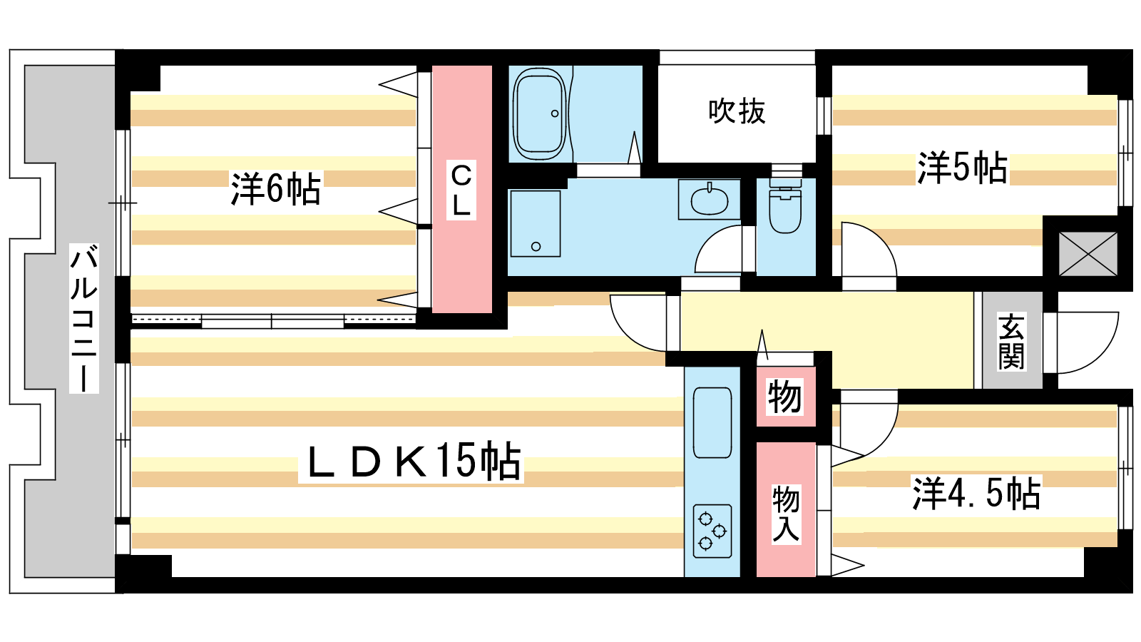 - 和室6帖、洋室5帖、洋室4.5帖、LDK15帖