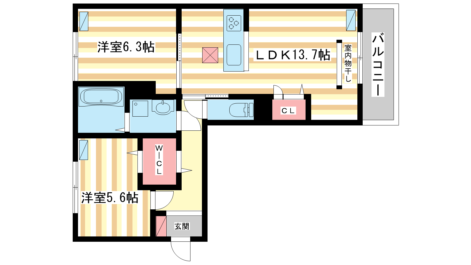 - LDK13.7帖、洋室6.3帖、洋室5.6帖