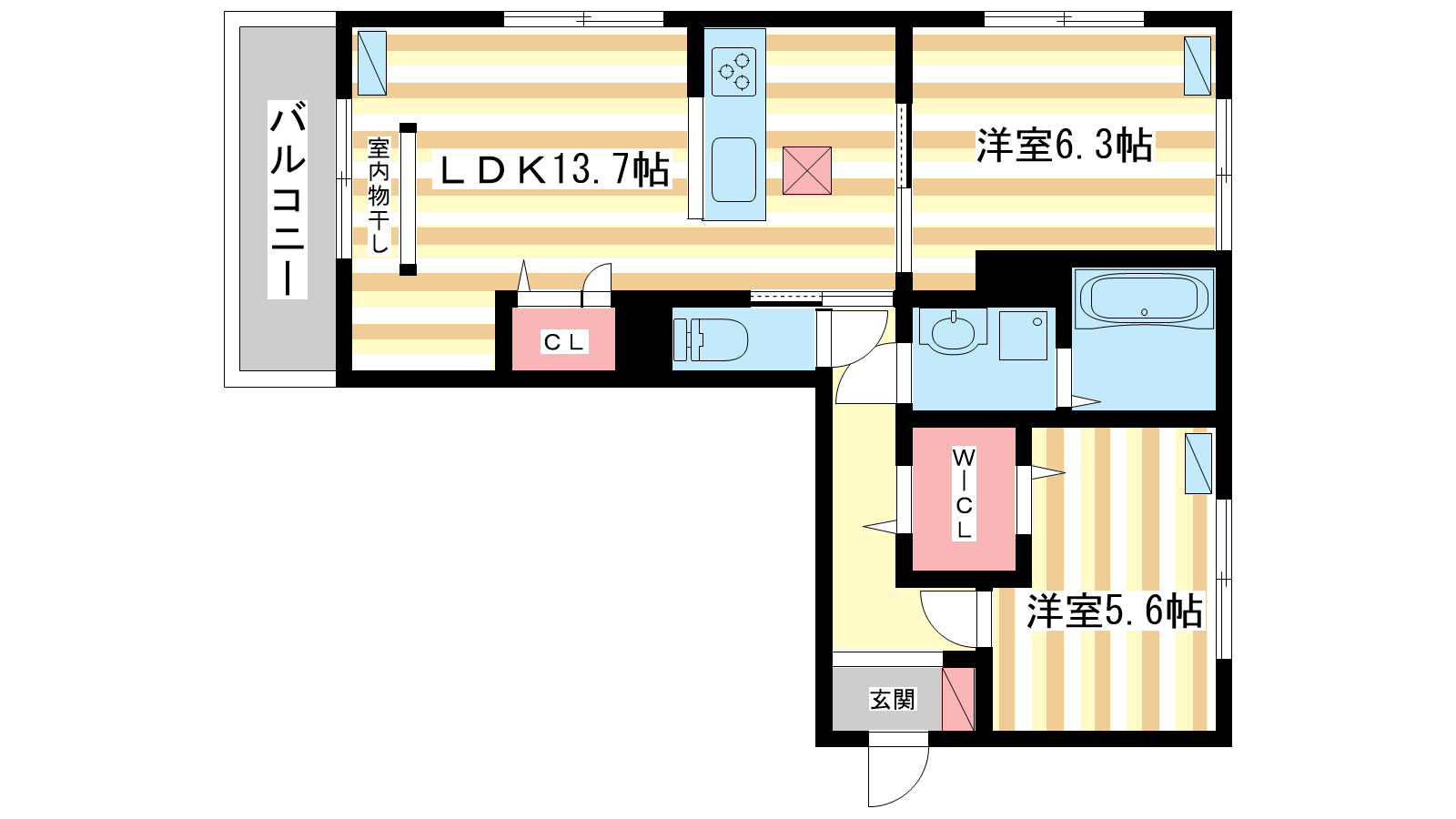 - LDK13.7帖、洋室6.3帖、洋室5.6帖