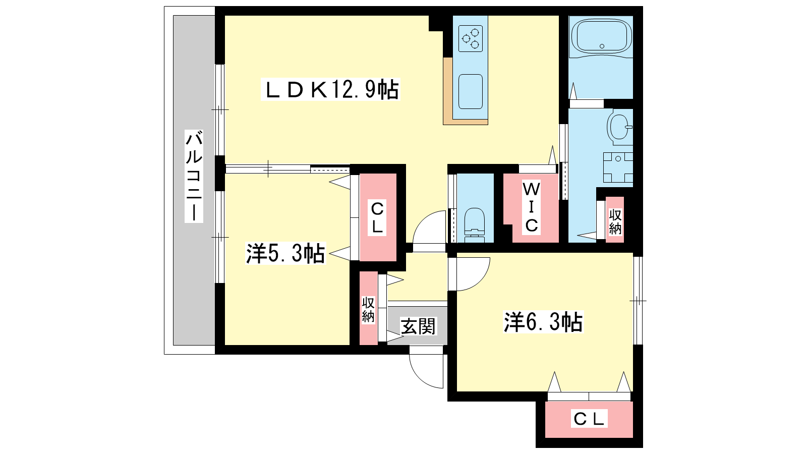 - LDK12.9帖、洋室6.3帖、洋室5.3帖