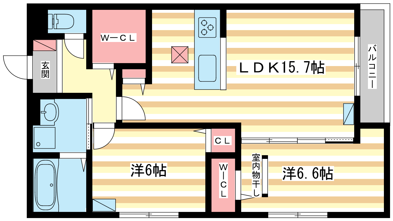 - LDK15.7帖、洋室6.6帖、洋室6帖