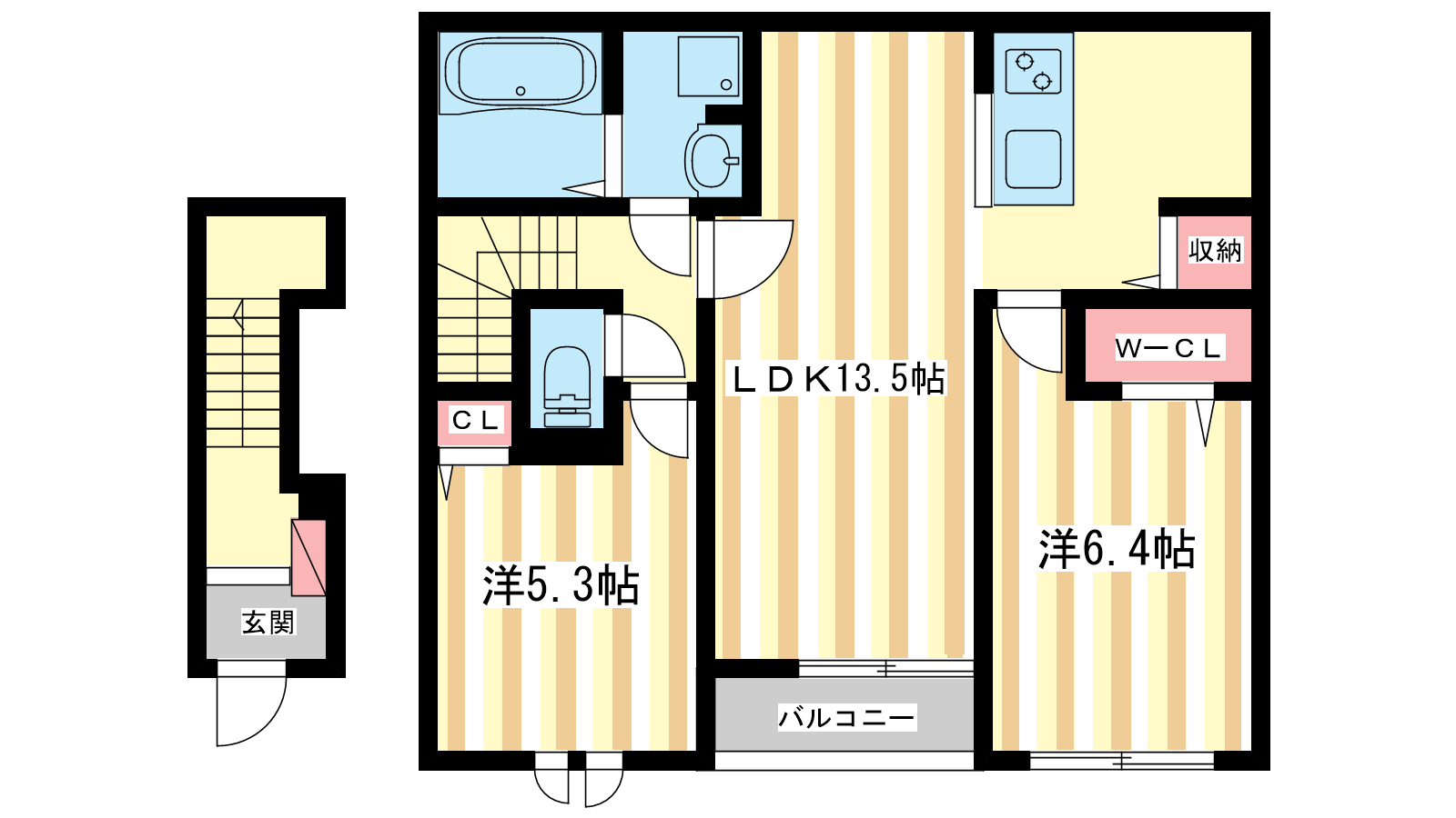 - LDK13.5帖、洋室6.4帖、洋室5.3帖